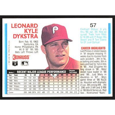 This is a 1992 Donruss Lenny Dykstra baseball card. The card is #57 and pictures show condition.