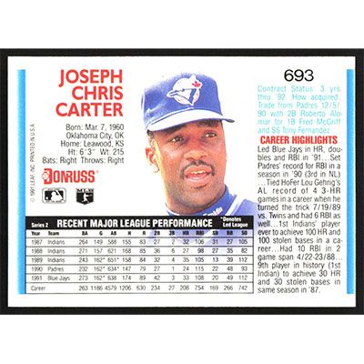 This is a 1992 Donruss Joe Carter baseball card. The card is #693 and pictures show condition.