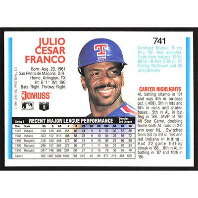 This is a 1992 Donruss Julio Franco baseball card. The card is #741 and pictures show condition.