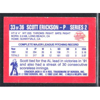 This is a 1992 Donruss Cracker Jack II Scott Erickson baseball card. The card is #33 and pictures show condition.