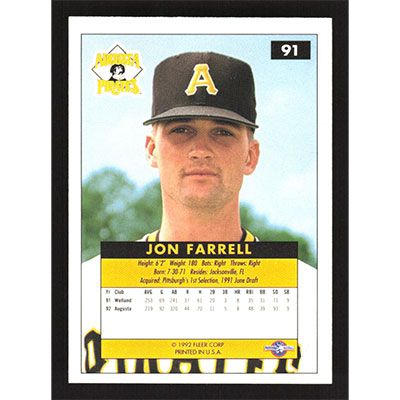 This is a 1992 Excel Jon Farrell baseball card. The card is #91 and pictures show condition.