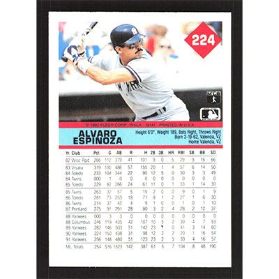This is a 1992 Fleer Alvaro Espinoza baseball card. The card is #224 and pictures show condition.