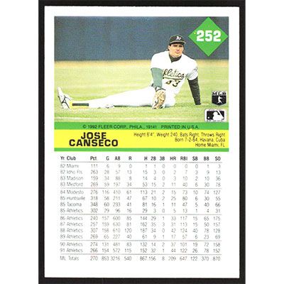 This is a 1992 Fleer Jose Canseco baseball card. The card is #252 and pictures show condition.