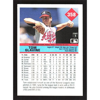 This is a 1992 Fleer Tom Glavine baseball card. The card is #358 and pictures show condition.