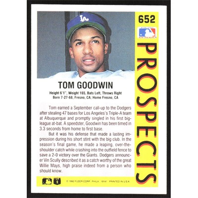 This is a 1992 Fleer Tom Goodwin Prospects baseball card. The card is #652 and pictures show condition.