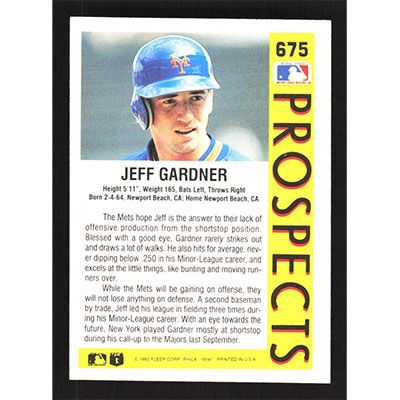 This is a 1992 Fleer Jeff Gardner Error - P on Front baseball card. The card is #675 and pictures show condition.