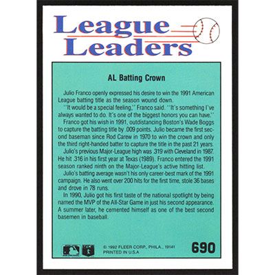 This is a 1992 Fleer Julio Franco League Leaders baseball card. The card is #690 and pictures show condition.