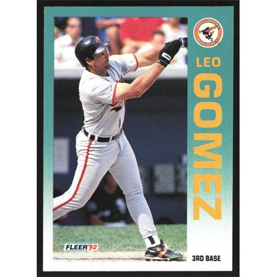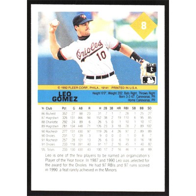 This is a 1992 Fleer Leo Gomez baseball card. The card is #8 and pictures show condition.