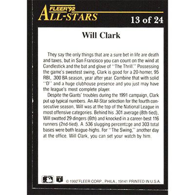 This is a 1992 Fleer All-Stars Will Clark baseball card. The card is #13 and pictures show condition.