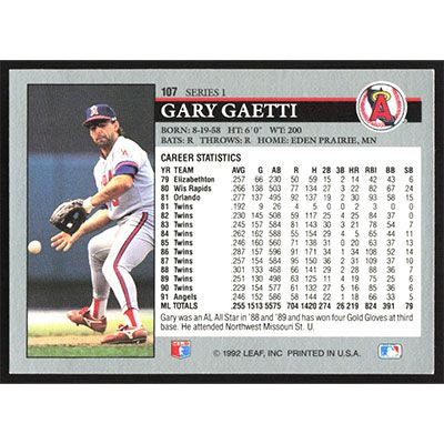 This is a 1992 Leaf Gary Gaetti baseball card. The card is #107 and pictures show condition.