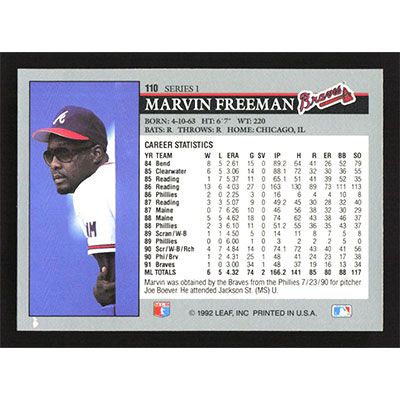 This is a 1992 Leaf Marvin Freeman baseball card. The card is #110 and pictures show condition.