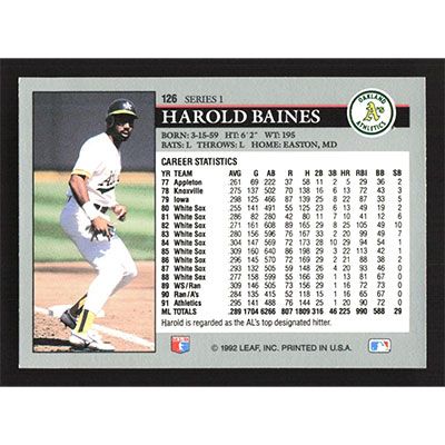 This is a 1992 Leaf Harold Baines baseball card. The card is #126 and pictures show condition.