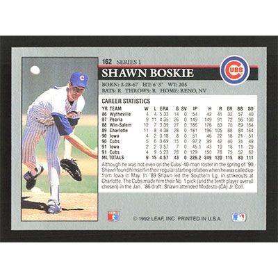 This is a 1992 Leaf Shawn Boskie baseball card. The card is #162 and pictures show condition.