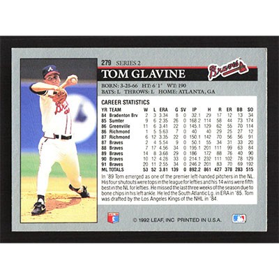This is a 1992 Leaf Tom Glavine baseball card. The card is #279 and pictures show condition.