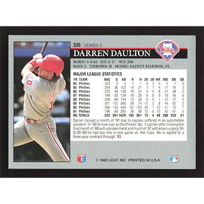 This is a 1992 Leaf Darren Daulton baseball card. The card is #335 and pictures show condition.