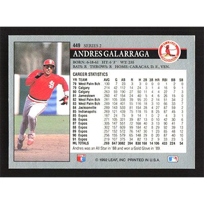 This is a 1992 Leaf Andres Galarraga baseball card. The card is #449 and pictures show condition.
