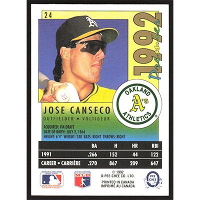 This is a 1992 O-Pee-Chee Premier Jose Canseco baseball card. The card is #24 and pictures show condition.