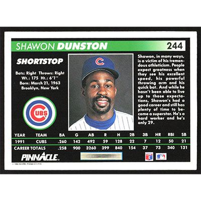 This is a 1992 Pinnacle Shawon Dunston baseball card. The card is #244 and pictures show condition.