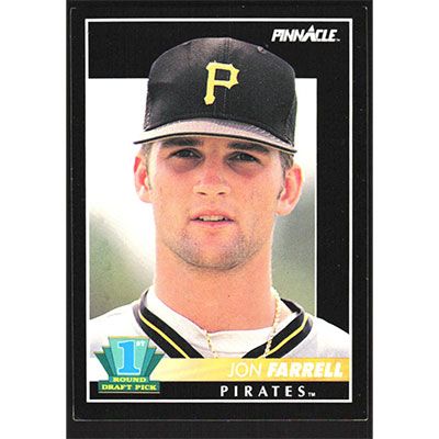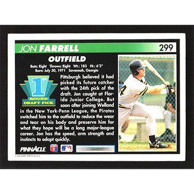This is a 1992 Pinnacle Jon Farrell baseball card. The card is #299 and pictures show condition.