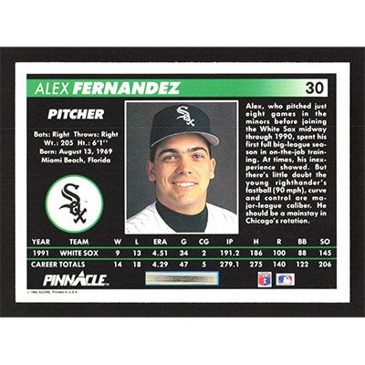 This is a 1992 Pinnacle Alex Fernandez baseball card. The card is #30 and pictures show condition.