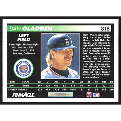 This is a 1992 Pinnacle Dan Gladden baseball card. The card is #318 and pictures show condition.