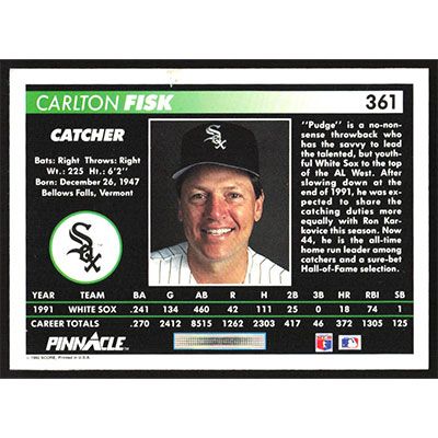 This is a 1992 Pinnacle Carlton Fisk baseball card. The card is #361 and pictures show condition.