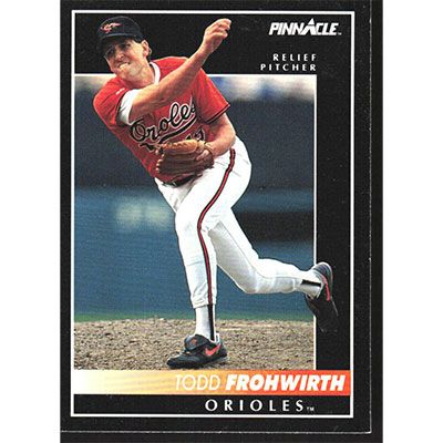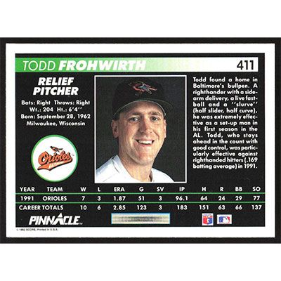 This is a 1992 Pinnacle Todd Frohwirth baseball card. The card is #411 and pictures show condition.