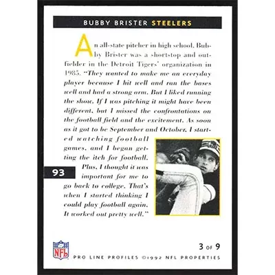 This is a 1992 Pro Line Profiles Bubby Brister football card. The card is #3 and pictures show condition.