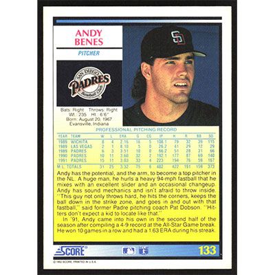 This is a 1992 Score Andy Benes baseball card. The card is #133 and pictures show condition.