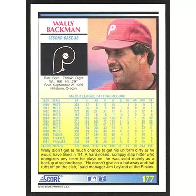 This is a 1992 Score Wally Backman baseball card. The card is #177 and pictures show condition.