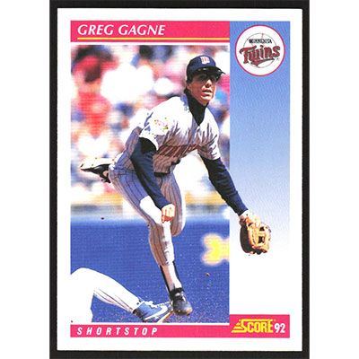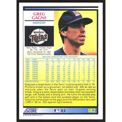 This is a 1992 Score Greg Gagne baseball card. The card is #182 and pictures show condition.