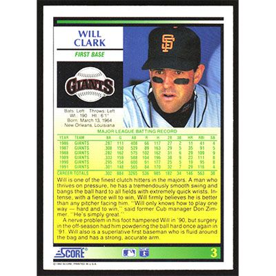 This is a 1992 Score Will Clark baseball card. The card is #3 and pictures show condition.