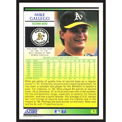 This is a 1992 Score Mike Gallego baseball card. The card is #43 and pictures show condition.
