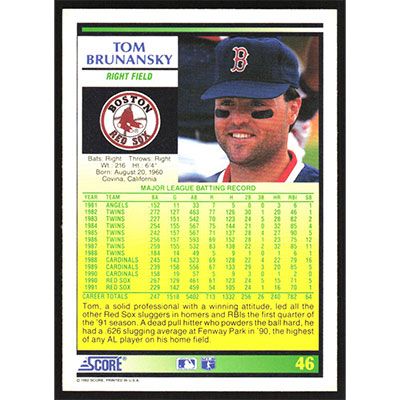 This is a 1992 Score Tom Brunansky baseball card. The card is #46 and pictures show condition.