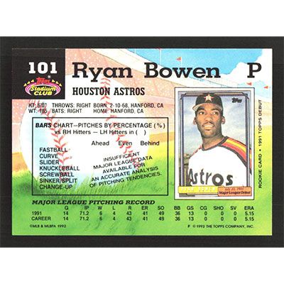 This is a 1992 Stadium Club Ryan Bowen baseball card. The card is #101 and pictures show condition.