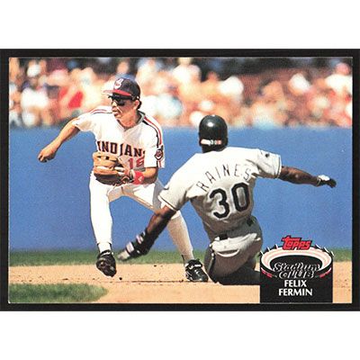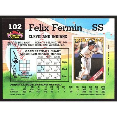 This is a 1992 Stadium Club Felix Fermin baseball card. The card is #102 and pictures show condition.