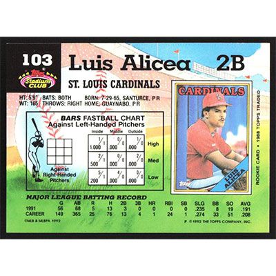 This is a 1992 Stadium Club Luis Alicea baseball card. The card is #103 and pictures show condition.
