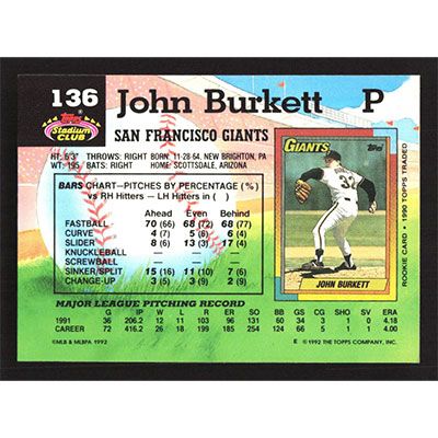 This is a 1992 Stadium Club John Burkett baseball card. The card is #136 and pictures show condition.
