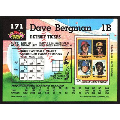 This is a 1992 Stadium Club Dave Bergman baseball card. The card is #171 and pictures show condition.