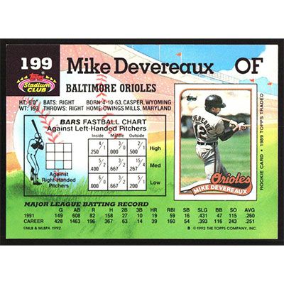 This is a 1992 Stadium Club Mike Devereaux autographed baseball card. This card has been signed, in blue, by Mike Devereaux, and is guaranteed authentic by Ballcardz.com. The card is #199 and pictures show condition.