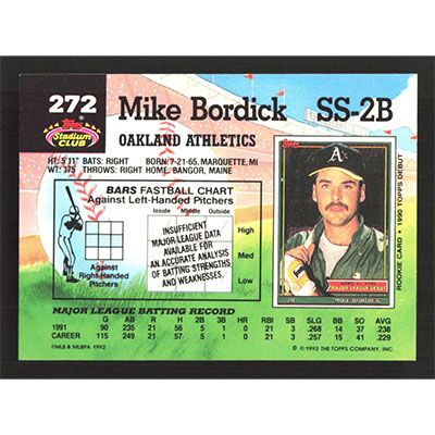This is a 1992 Stadium Club Mike Bordick baseball card. The card is #272 and pictures show condition.