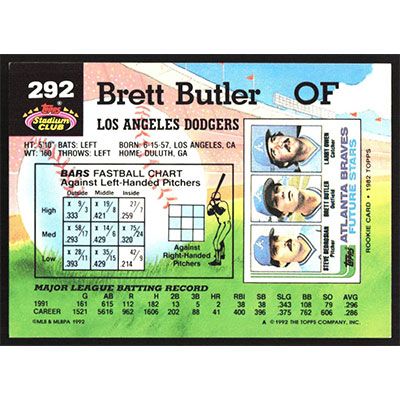 This is a 1992 Stadium Club Brett Butler baseball card. The card is #292 and pictures show condition.