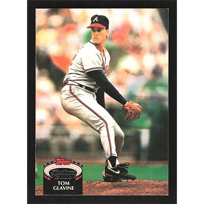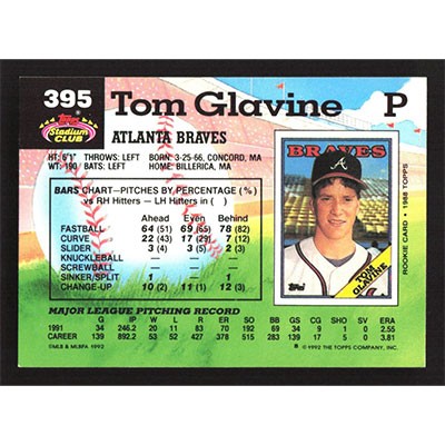 This is a 1992 Stadium Club Tom Glavine baseball card. The card is #395 and pictures show condition.