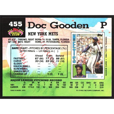 This is a 1992 Stadium Club Doc Gooden baseball card. The card is #455 and pictures show condition.