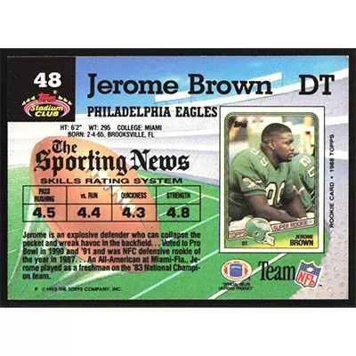 This is a 1992 Stadium Club Jerome Brown football card. The card is #48 and pictures show condition.