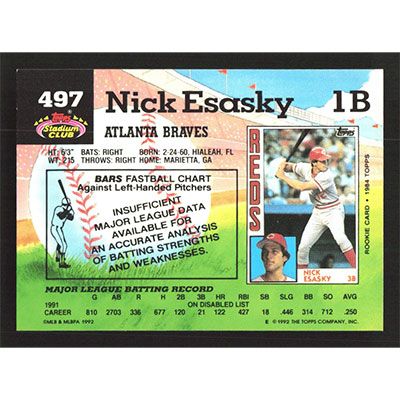 This is a 1992 Stadium Club Nick Esasky baseball card. The card is #497 and pictures show condition.