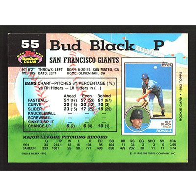 This is a 1992 Stadium Club Bud Black baseball card. The card is #55 and pictures show condition.