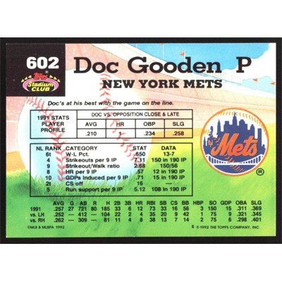 This is a 1992 Stadium Club Doc Gooden Members Choice baseball card. The card is #602 and pictures show condition.
