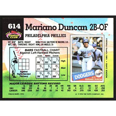 This is a 1992 Stadium Club Mariano Duncan baseball card. The card is #614 and pictures show condition.