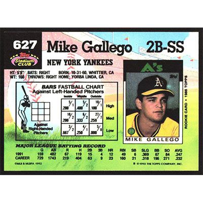 This is a 1992 Stadium Club Mike Gallego baseball card. The card is #627 and pictures show condition.